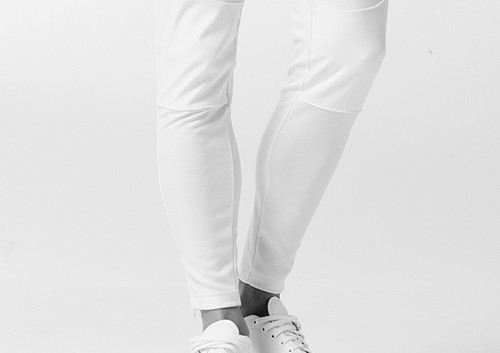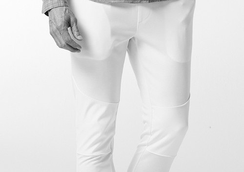 また、膝上のバイカーパンツ風の切替部分のみストレッチタフタを使用し、デザインのアクセントになっています。