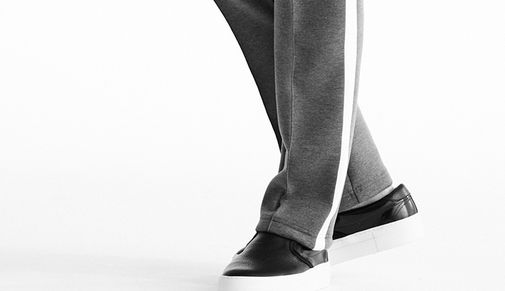 ウエストはゴム+ドローコード付のイージー仕様で前身にのみセンタークリース(縦の切替線)を採用し、クラシックとモダンを掛け合わせたデザインです。