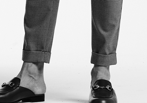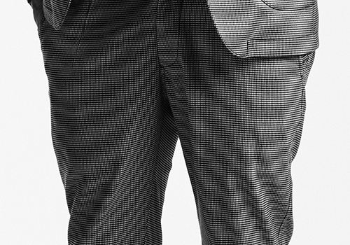厳選した各表地はストレッチ性に富んでおり快適な着用感を保証します。釦は AKM 定番の本水牛六穴釦です。今期はパンツの裾をダブル仕上げにてご提案します。