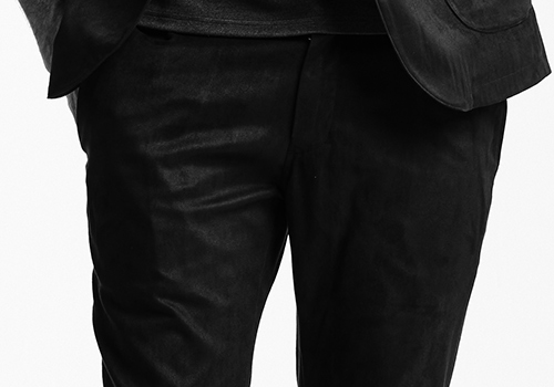 厳選した各表地はストレッチ性に富んでおり快適な着用感を保証します。釦は AKM 定番の本水牛六穴釦です。今期はパンツの裾をダブル仕上げにてご提案します。