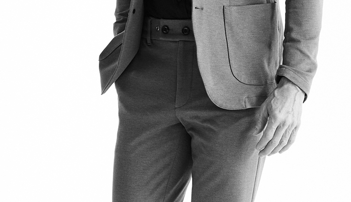 裾はシングル仕上げ、タックを無くし、股上をやや浅くすることで、シャープな美しいシルエットを完成させました。