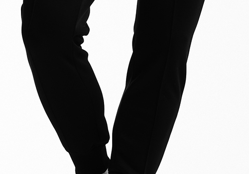 ウエスト紐付き、裾リブ仕様のイージーパンツです。定番のSWING EASYパンツよりもヒップ、ワタリを若干大きく設定していますが、美シルエットはそのままに仕上げています。前身にのみセンタークリース(縦の切替線)を採用し、クラシックとモダンを掛け合わせたデザインです。
