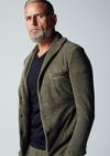 ショール衿の3釦ジャケットです。脇下の細腹をリブ使いし、