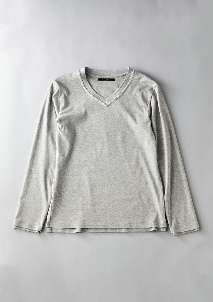 【T206 / SMOOTH COTTON L/S HAND STITCH V-NECK -GRAY-】