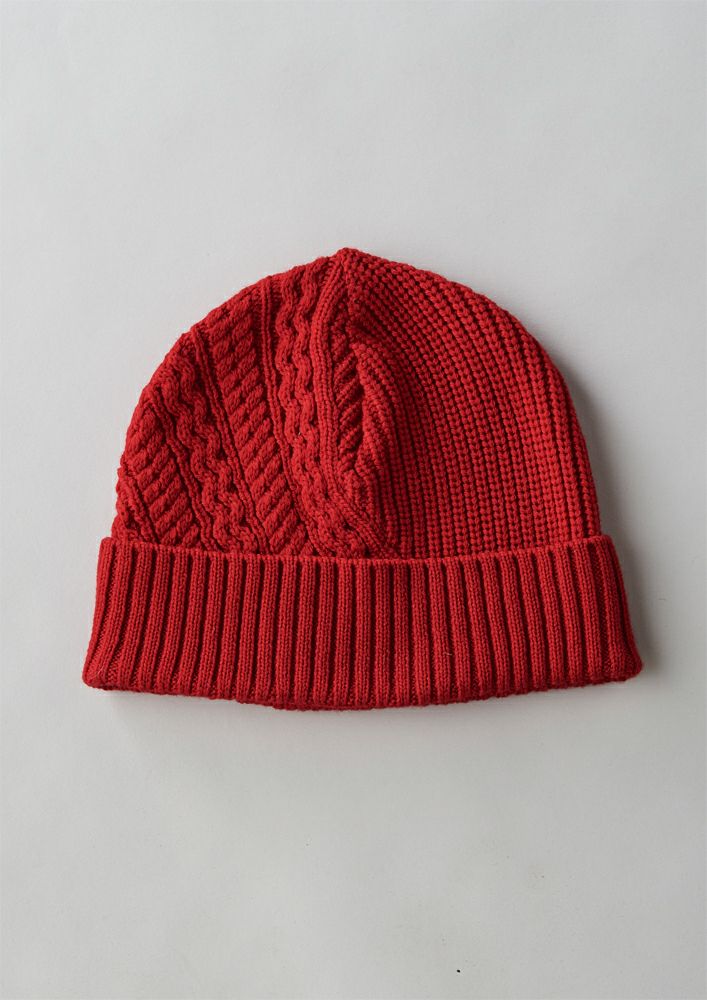 もう片側をタックを入れる編み方の片畦編みと天竺表目を交差する事で立体感を出す編み方の縄編みを
