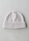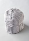 もう片側をタックを入れる編み方の片畦編みと天竺表目を交差する事で立体感を出す編み方の縄編みを