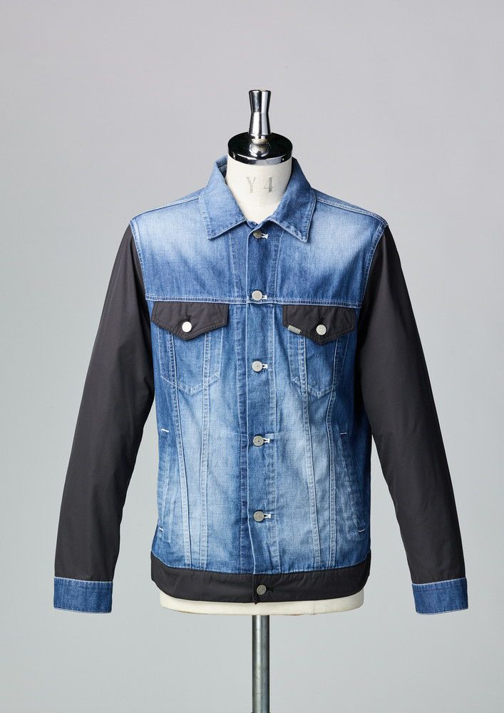 5.5ozの綿100%デニムを身頃に、胸フラップ、袖、裾はストレッチタフタを採用した一風変わった軽量3rd型ブルゾンに仕上げています。デニム部分はリアルなVINTAGEを追求したユーズド加工を施しています。シンプルなAKMロゴクリップが商品を引き締めています。