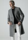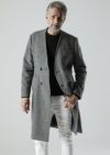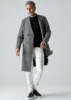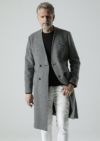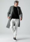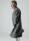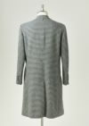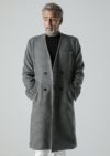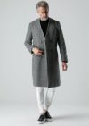 新型のセミダブルノーカラーチェスターコートです。2つボタンのダブル仕立てで、袖口は本切羽仕様。