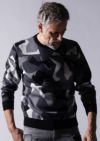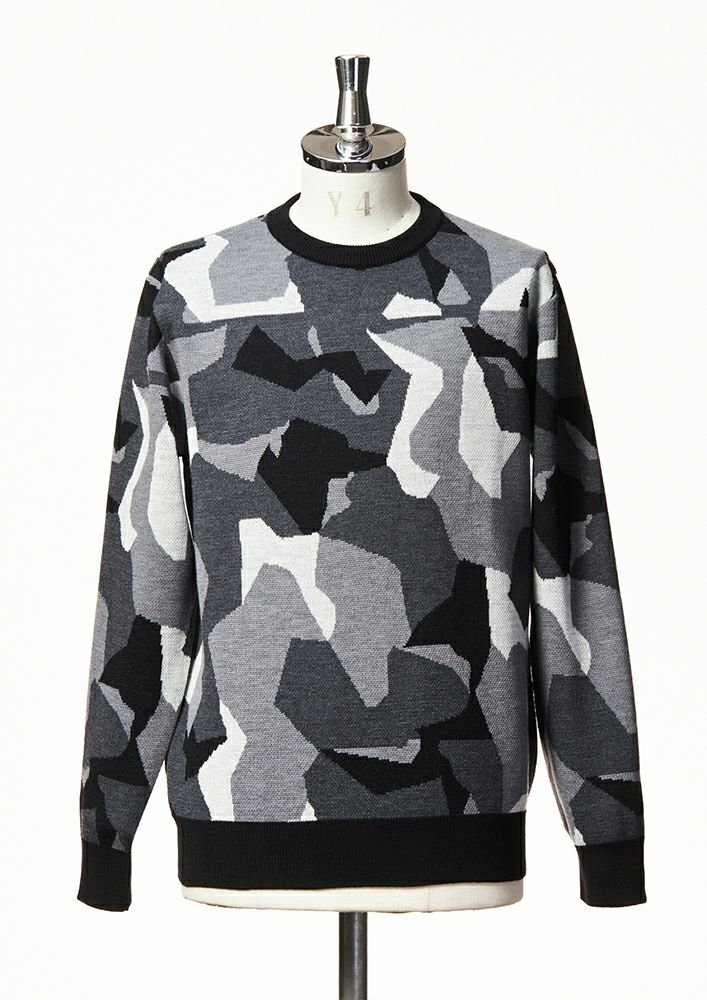 今季のテーマ柄の一つであるスウェーデンカモ(幾何学迷彩)を12G(ゲージ)のWジャガードで表現しています。