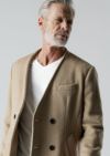 新型のセミダブルノーカラーチェスターコートです。2つボタンのダブル仕立てで、袖口は本切羽仕様。