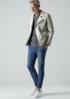 タイトフィットな”デニスラ”(デニムスラックス)の発表です。カジュアルの代名詞的なデニム素材をドレッシーなセンタープレス入りスラックスに落とし込みました。