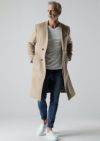 フロントはタック釦で、前開きは ZIP 仕様です。後ポケットは釦を付けずに両玉縁ポケットにし、裾はダブルに仕上げています。