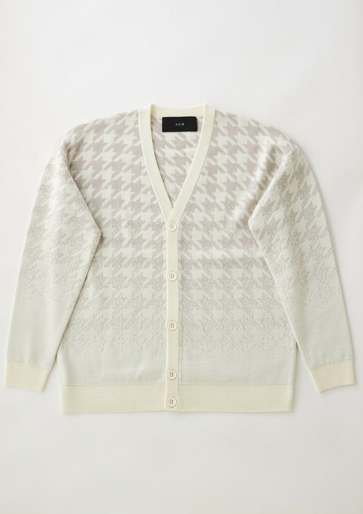 AKMオリジナルの千鳥柄グラデーションニットの登場です。ハッキリとした千鳥柄を裾に向かってグラデーションで徐々に薄くしています。ジャガード+減らし目の仕様が玄人好みで、適度な肉感で扱いやすいニットです。21AWではプルオーバーのクルーネックを発表しましたが、今季はVカーディガン型をご提案します。釦は本水牛六穴釦を採用。