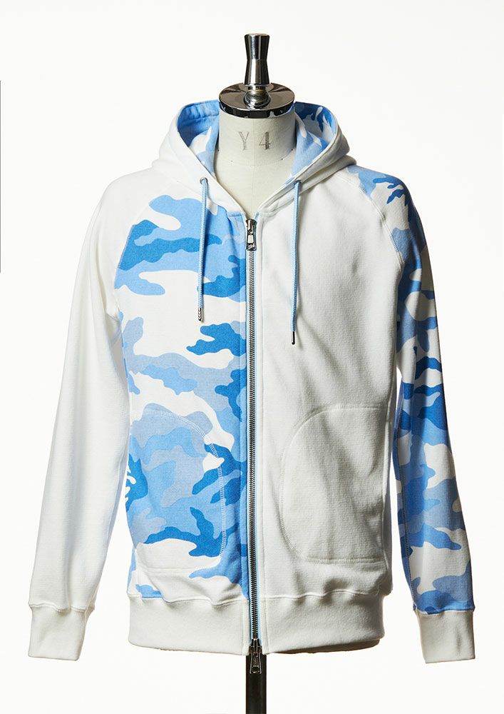 さらに今回から生地でのタンブラー加工を施し、仕上がり後の 縮率の誤差の低下も実現し、風合いもさらにソフト感とふっくら感が増しています。 今回はパイル面を裏に使用して、ふっくらしたパイルの柔らかさを肌面で感じられる仕上がりです。 さらに生地の状態で、顔料プリントにて""AKMオリジナルCAMO柄”をほどこしたものも展開しています。
