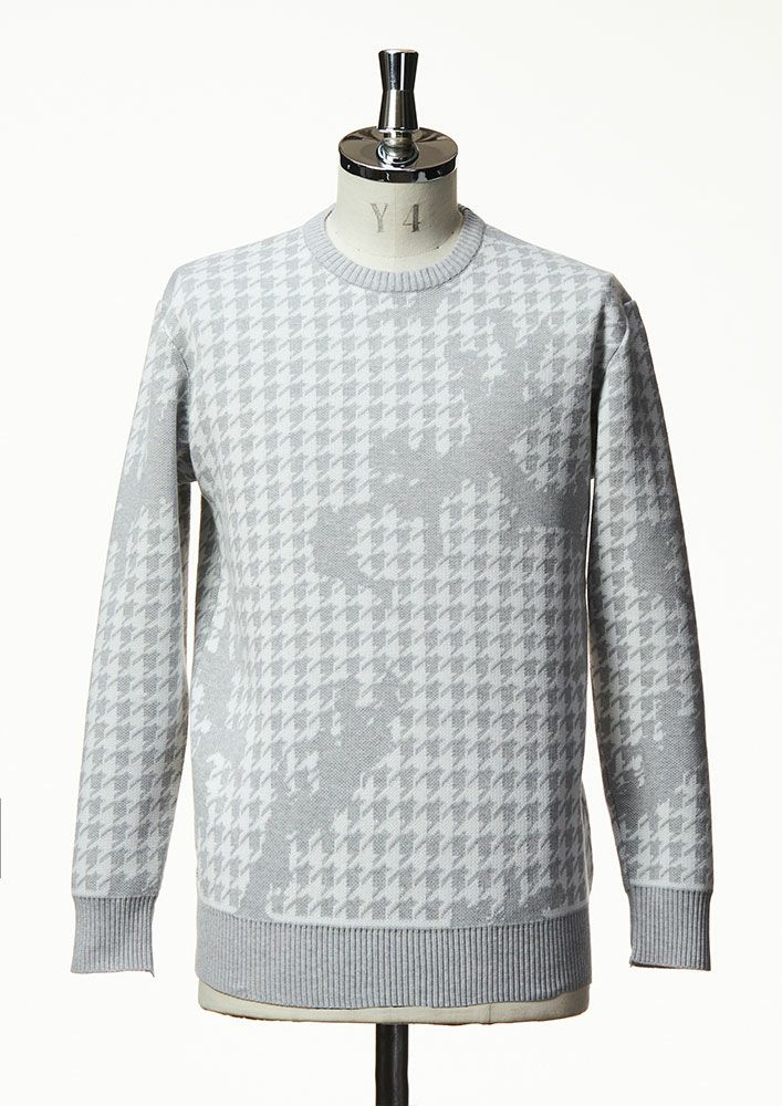 ダブルジャガードで編み立てる事で、AKMオリジナルの「千鳥カモ柄」を表現しつつ、 伸縮性がありしなやかな風合いに仕上げています。 尚、編地がしっかり上がり型崩れがしにくい編み組織となっております。