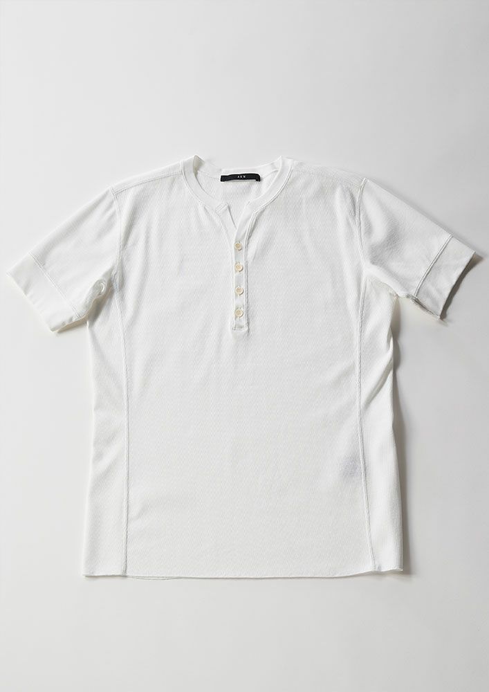 定番型として毎シーズン展開しているヘンリーネック半袖TEE。 ヘンリーネックとは元来、丸首の変形デザインの一種で、丸首に短い前立てが付き、