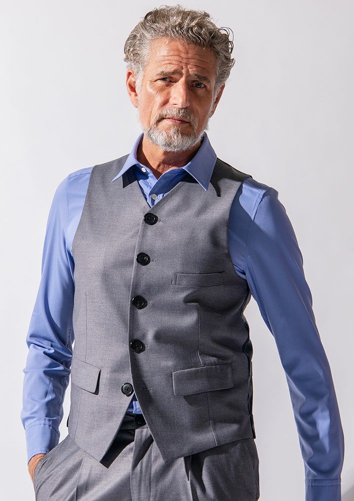 ジャケット・スラックススタイルに更なるフォーマル感を高めるジレ。中衣として過度なデザインは避けています。今季は前身をダブル仕立てにし、肩巾、身巾、袖巾など着用しやすく、且つ美しいシルエットを生むようにパターンを再構築しています。本水牛六穴釦、フラップポケットを採用し、 後身は滑りを改善する為にキュプラ素材を採用しています。