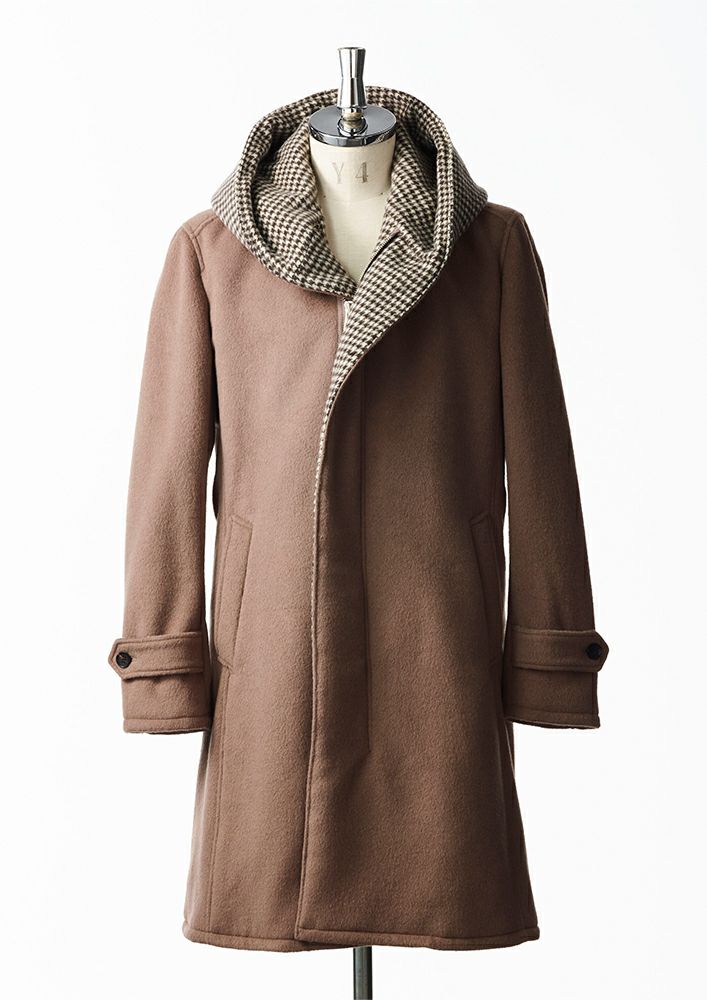 18AWからアップデートし続けているフーデッドコートです。大きなフード回りのシルエットをいかに美しく見せるかに拘りながら、フロントはAKMオリジナルのエクセラZIP仕様。腰は箱ポケットを採用し、後ウエストのアジャストベルトは排除し、表地の良さを一番に感じられるよう、シンプルに仕上げました。フード表裏、身返し、袖タブ裏を別布<千鳥格子>で切替、デザインしています。