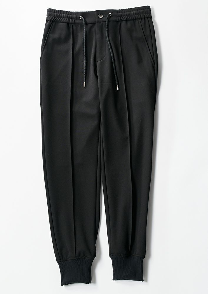 ウエスト紐付き、裾リブ仕様のイージーパンツです。定番のSWING EASYパンツよりもヒップ、ワタリを若干大きく設定していますが、美シルエットはそのままに仕上げています。前身にのみセンタークリース(縦の切替線)を採用し、クラシックとモダンを掛け合わせたデザインです。
