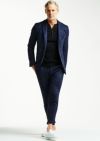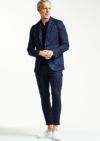 AKM ではV首に変形デザインして、首元の開きを広くすることでシャープな印象を与え、すっきりとしたデザインに仕上げています。釦はAKMオリジナルの本水牛四つ穴釦を採用しています。