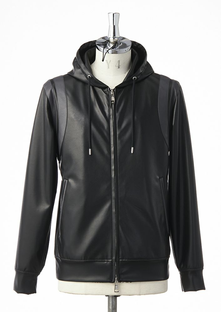 【B504 / PEU018 / ECO LEATHER VARSITY ZIP PARKA -BLACK/D.GRAY-】