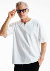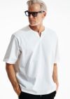キーネックの半袖カットソーの登場です。キーネックとは丸首に縦の切り込みを入れたネックラインで、すっきりとしながらもデコラティブな印象を与えます。