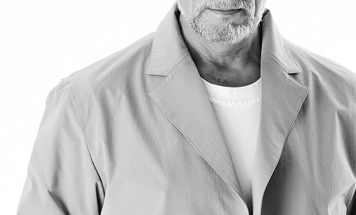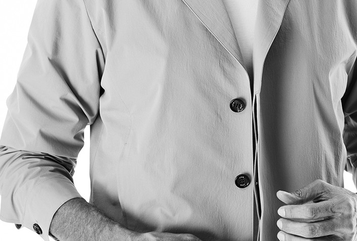フロント釦は比翼仕様、前身の切替を利用した腰のポケットなど全体的にシンプルでスッキリと洗練された印象に仕上げています。