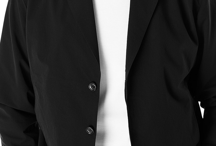 ストレッチ裏地による総裏地仕立てで、釦はAKMロゴ入り本水牛釦を採用しています。
