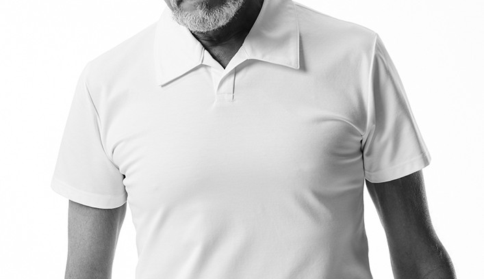 小ぶりのレギュラー衿を採用し、前開きを浅くし、フロント釦を排除することで、シンプルに仕上げています。