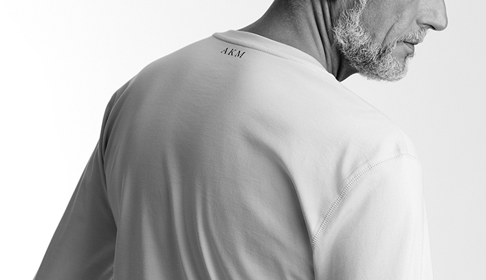 後身頃の首下にはAKMロゴをさりげなくプリント。
