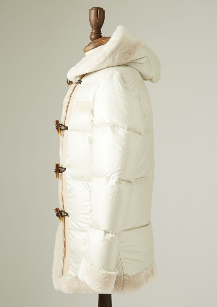 • レザーとファー、レザーとファブリックなど、 高級素材を巧みに組み合わせることによって、程よいラグジュアリー感を演出しました。 また、素材使いのみならず、人間の体躯を熟知した 絶妙なフィッティングも「エンメティ」の大きな魅力です。 ムートンは最高級のスペイン産の羊革、羽毛はダウン90%、フェザー10%です。