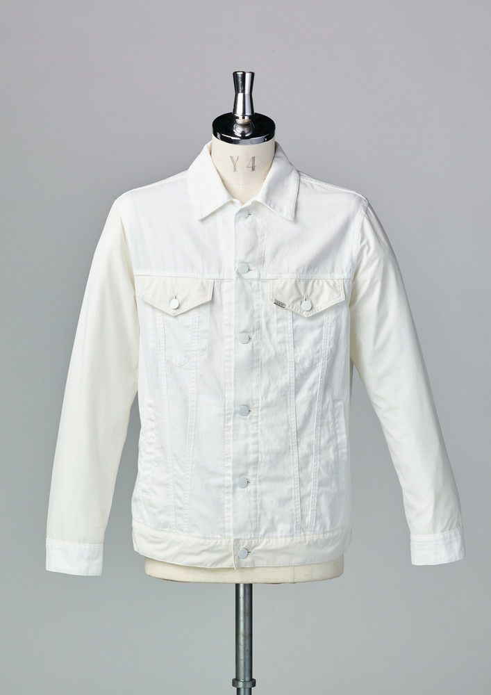 5.5ozの綿100%デニムを身頃に、胸フラップ、袖、裾はストレッチタフタを採用した一風変わった軽量3rd型ブルゾンに仕上げています。デニム部分はリアルなVINTAGEを追求したユーズド加工を施しています。シンプルなAKMロゴクリップが商品を引き締めています。