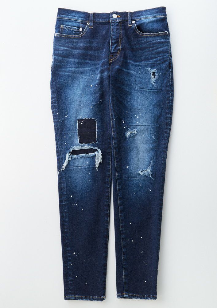 構築したデニムパンツです。スキニーフィッティングとテーパードしたシルエットがまさにタウンユースと言える仕上がりを見せています。今季は程よいリペア&パッチワークを施し、ホワイトとブラックはワンウォッシュ+立体ヒゲ、インディゴはアイスウォッシュ加工を施しました。また、インディゴ濃色ユーズドにのみペンキ加工を追加しています。後ポケットに付けているお馴染みのAKMロゴクリップが商品を引き締めています。""