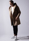 フロントはタック釦で、前開きは ZIP 仕様です。後ポケットは釦を付けずに両玉縁ポケットにし、裾はダブルに仕上げています。