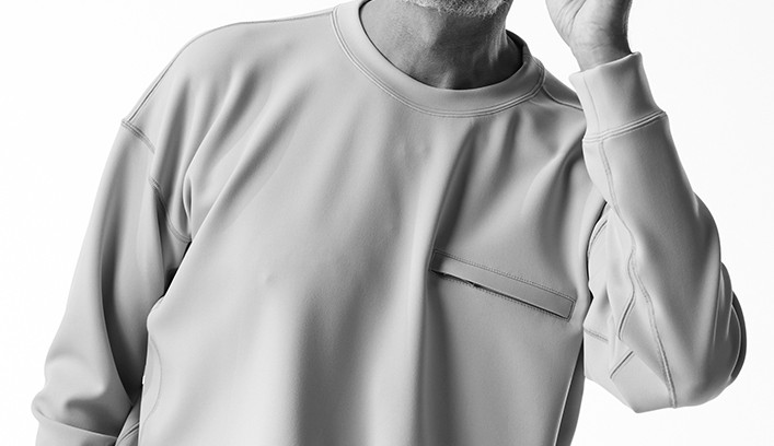 また、袖口、裾部分の切替は通常リブを使用しますが、ストレッチ性、キックバック性の高い表地共地にしミニマルに仕上げています。