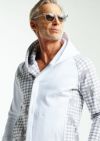 企画が始まって以来ずっと奈良の編み工場にて編み続けているこの生地は、その強力なストレッチのため染色加工の段階でかなりのシワが入ってしまうのを泉州の染色工場が何度も時間をかけて仕上げることでシワを伸ばし生地に仕上げています。 プリントもずっと泉州のプリント工場で加工しており、安定的なクオリティを保証します。今季は無地のホワイト、杢グレー、黒の3色、無地とAKMオリジナル千鳥カモ柄のクレイジー仕様にした2色 計4色展開です。