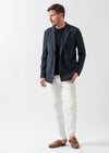 釦にはAKM定番の本水牛六穴釦を採用し、軽快なジャケットの中にも確かな品格を添えています。