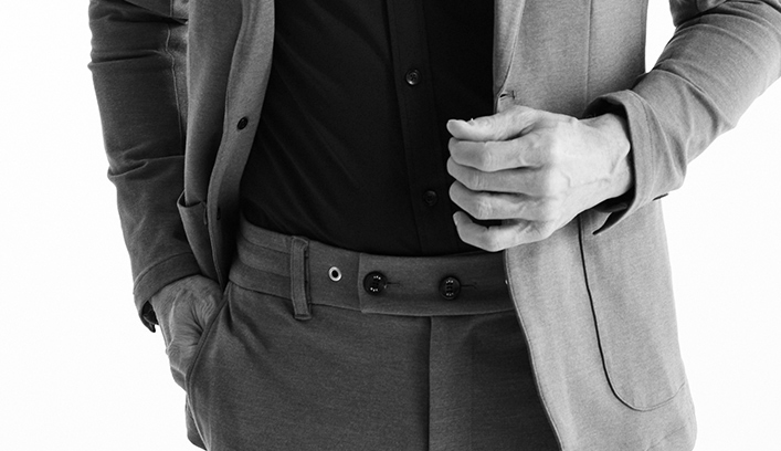 ストレッチ性にも富んでいるので快適な着用感を保証します。釦は AKM 定番の本水牛六穴釦です。