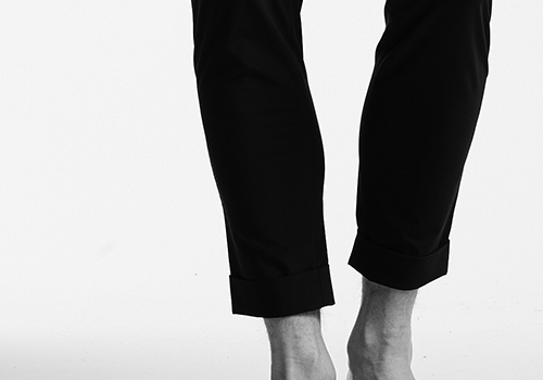 釦は AKM 定番の本水牛六穴釦です。今季はパンツの裾をダブル仕上げにてご提案します。