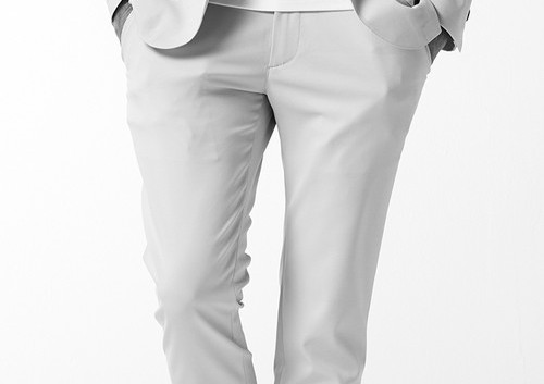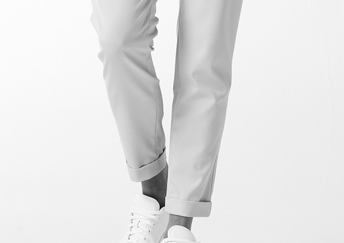 釦は AKM 定番の本水牛六穴釦です。今期はパンツの裾をダブル仕上げにてご提案します。
