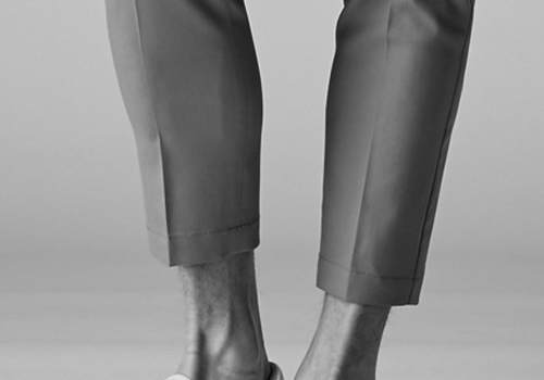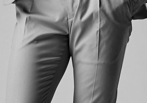 で、セットアップのスタイリングだけでなく、単体でも穿けるようにしています。今季は裾の処理をシングル仕上げにしています。