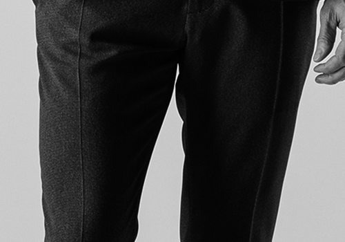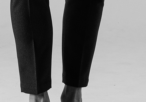 で、セットアップのスタイリングだけでなく、単体でも穿けるようにしています。今季は裾の処理をシングル仕上げにしています。"