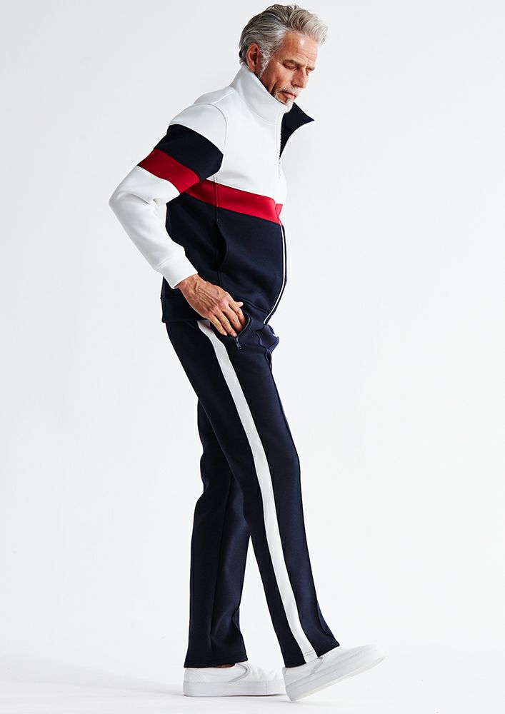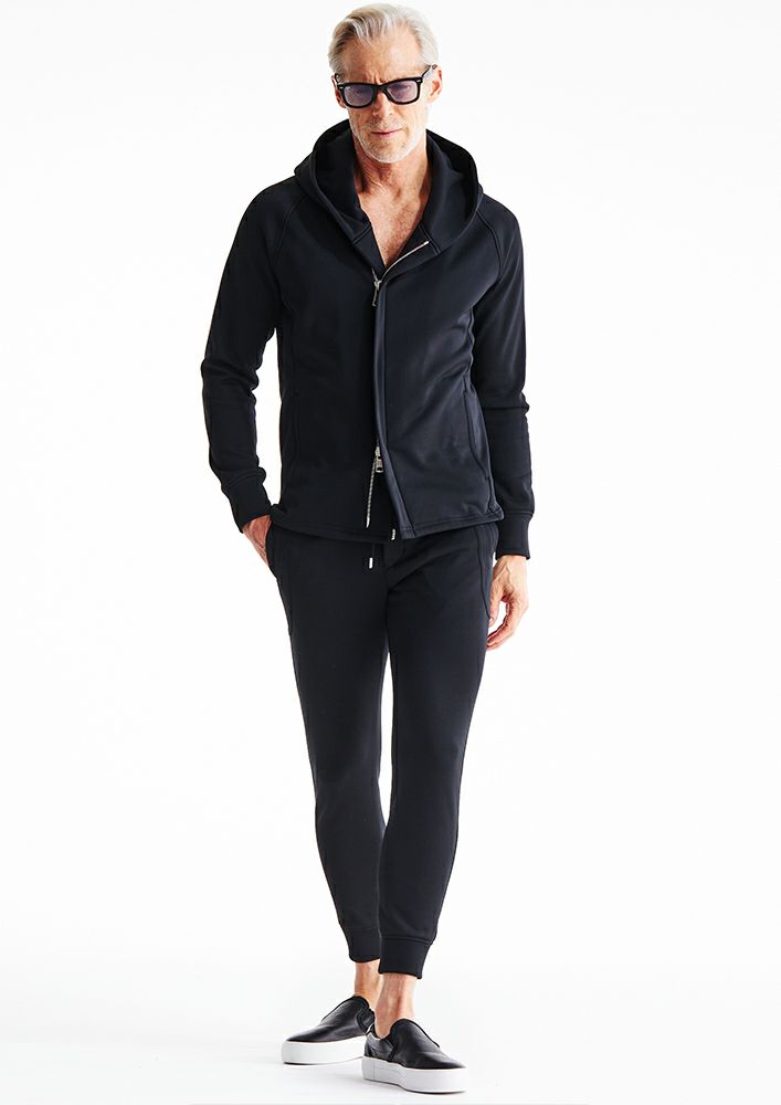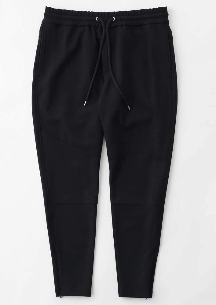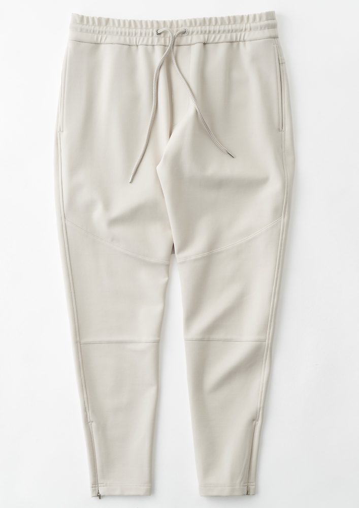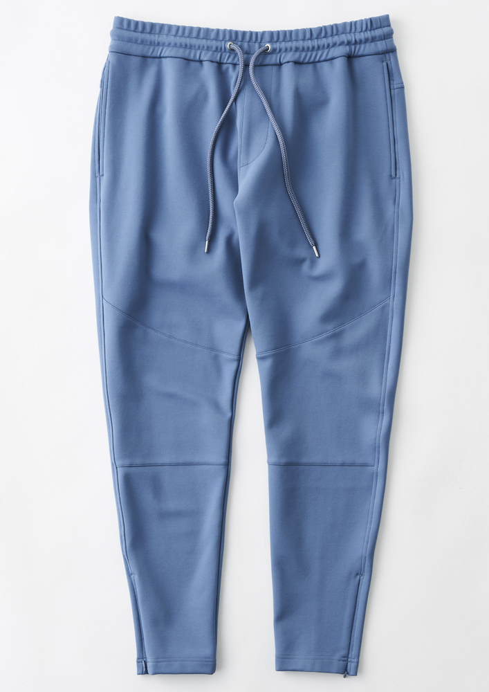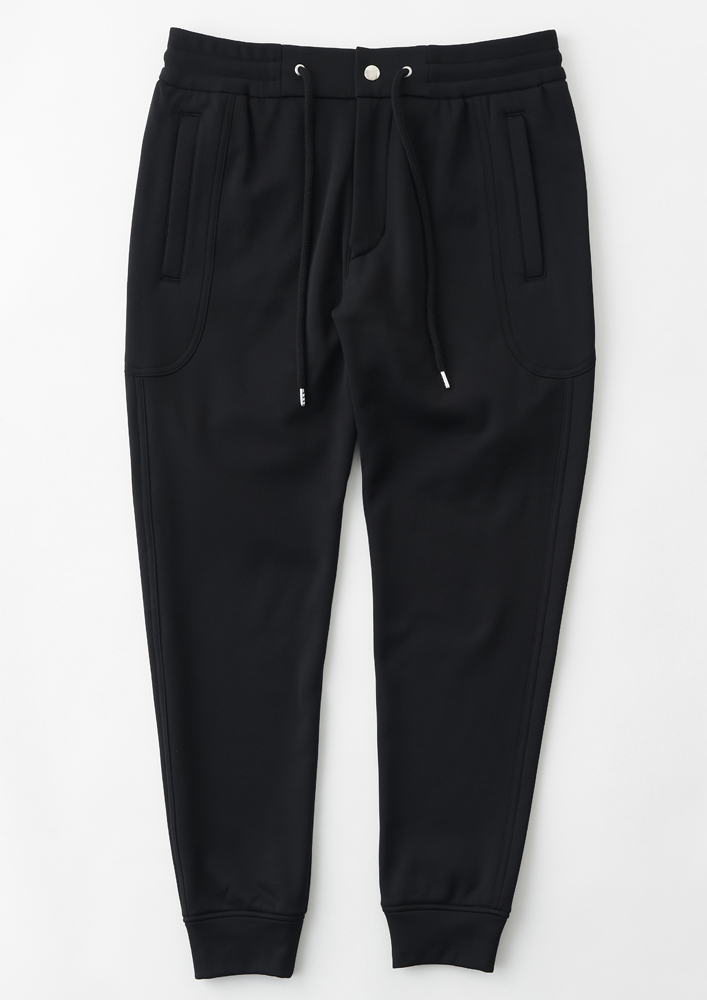 シームを利用した腰ポケットや袖口、裾にリブを使用せず、表地共地にすることでミニマルに仕上げています。