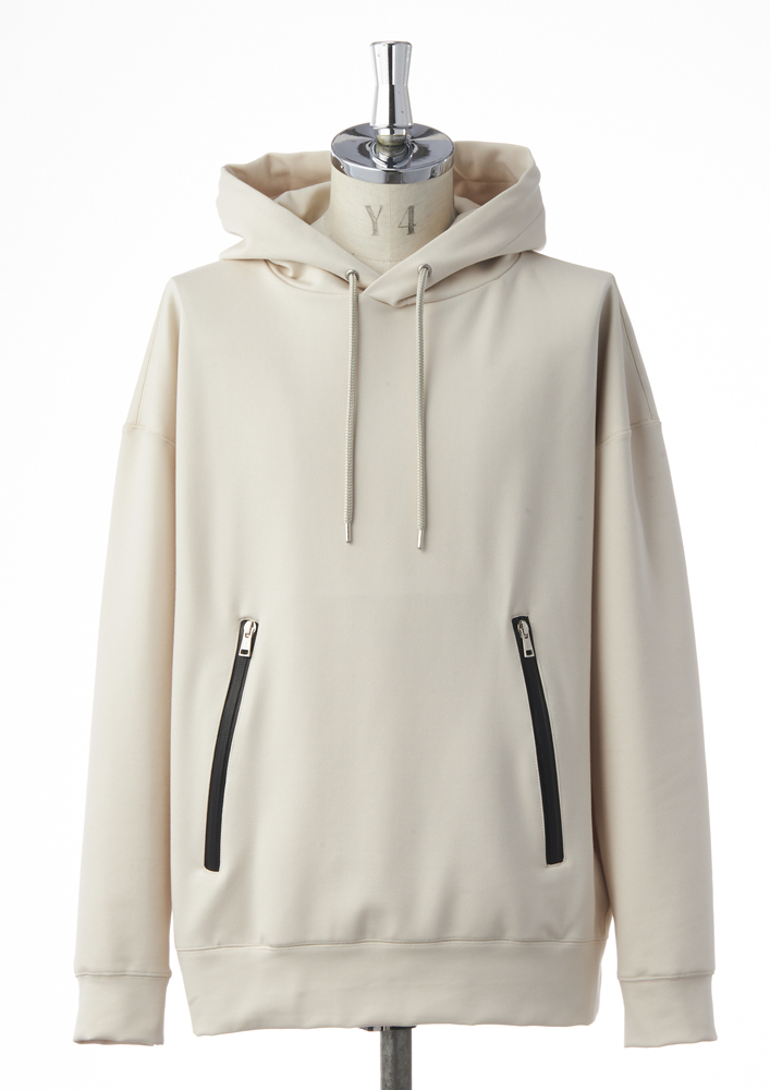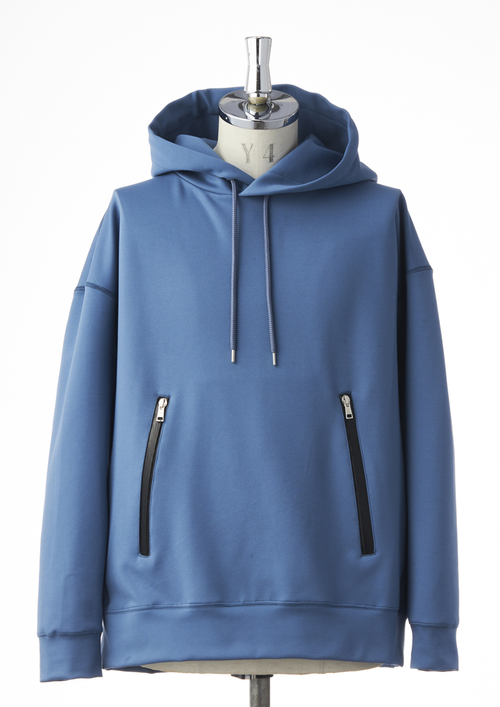 大きめのフード、ドロップショルダー、ボリュームのある身巾、また袖から脇、脇から裾へと続く切替ステッチが立体感を生み出します。