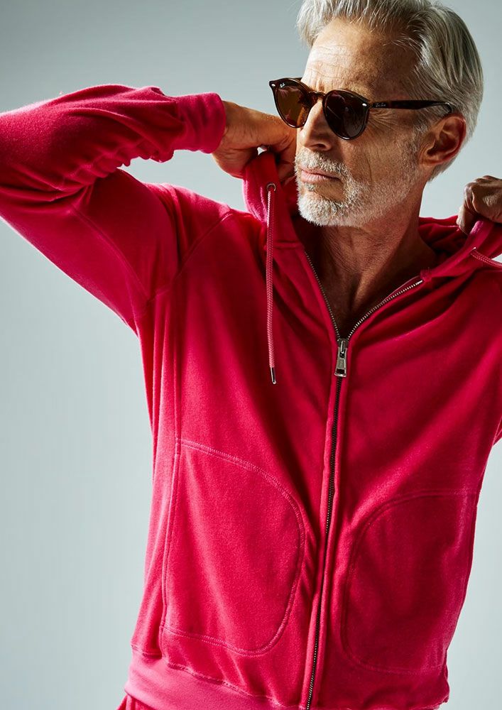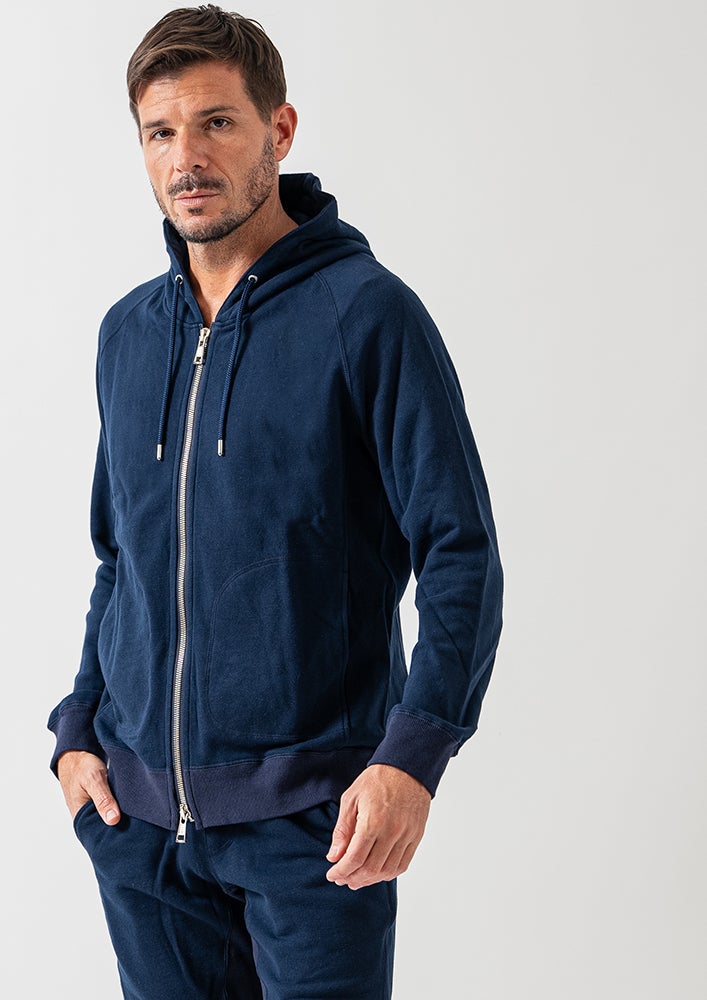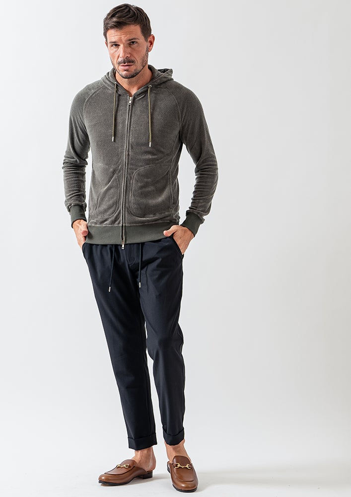 やわらかな表情のジップパーカーにダークトーンのパンツを合わせ、リラックス感の中に都会的な落ち着きを加えたスタイル。