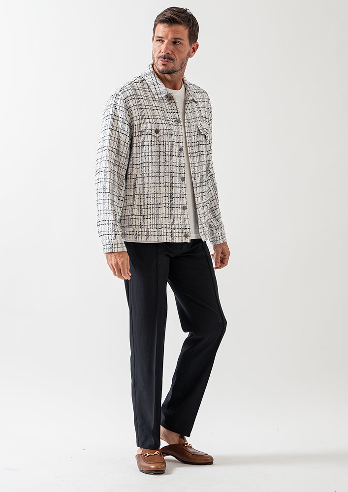 表情豊かなツイード調アウターを主役に、ホワイトのインナーとブラックパンツでメリハリを効かせた洗練のスタイル。
