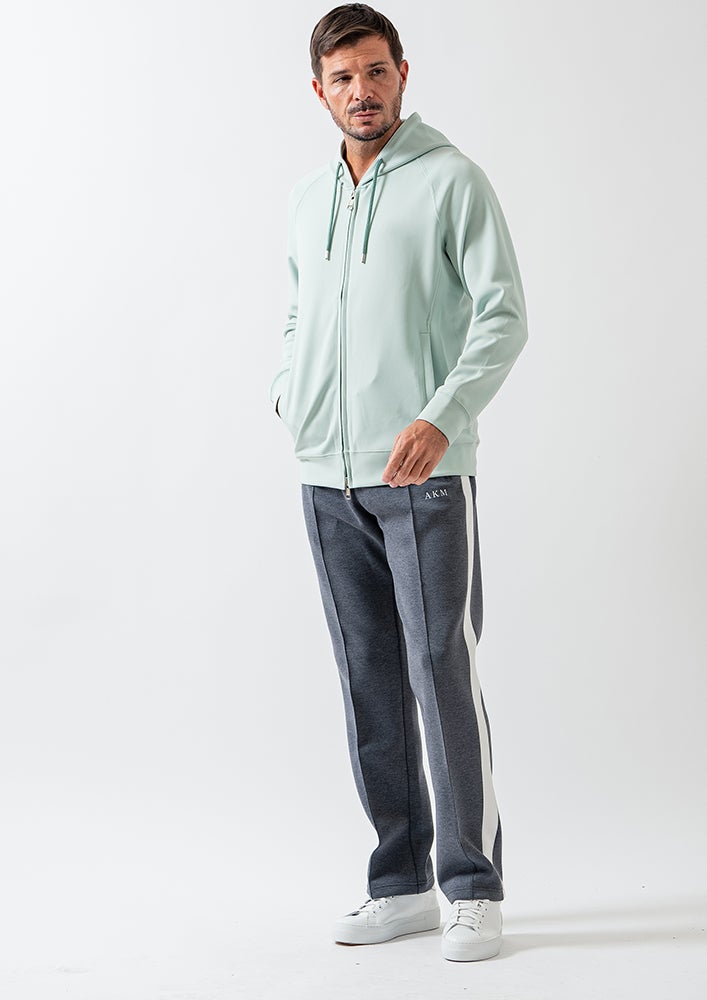 爽やかなミントカラーのジップパーカーを主役に、グレーのパンツで落ち着きを添えた軽快なスタイル。